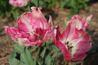 But finally she seems to have made up her mind and we will have spring. The parrot tulips are up and glorious in all their pink splendor and the red tulips, keeping all the herbs company, beckon us to eat our meals out in the garden, which we obey, gladly .